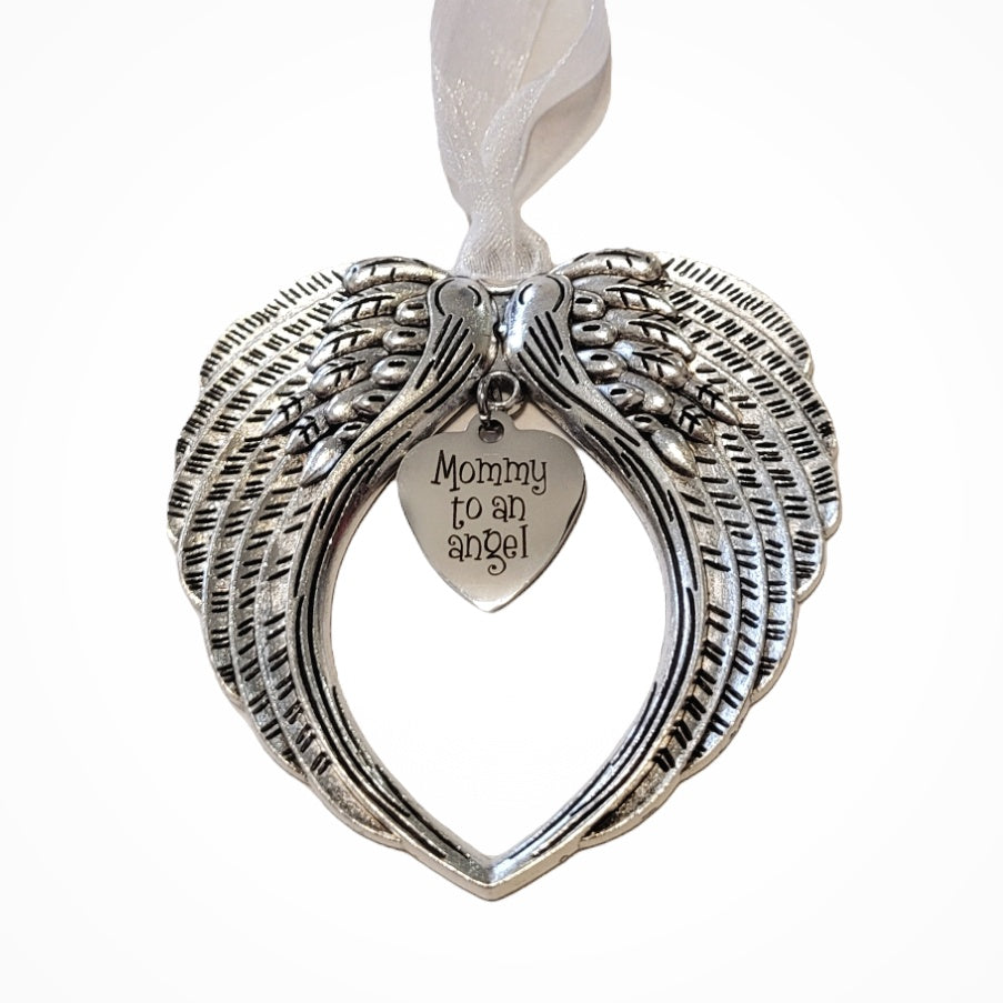 Angel wings in memory of a loved one lost. Measures 65x69mm. Can be used as a Christmas tree ornament or as a memorial keepsake. Comes in an organza gift bag ready to gift.